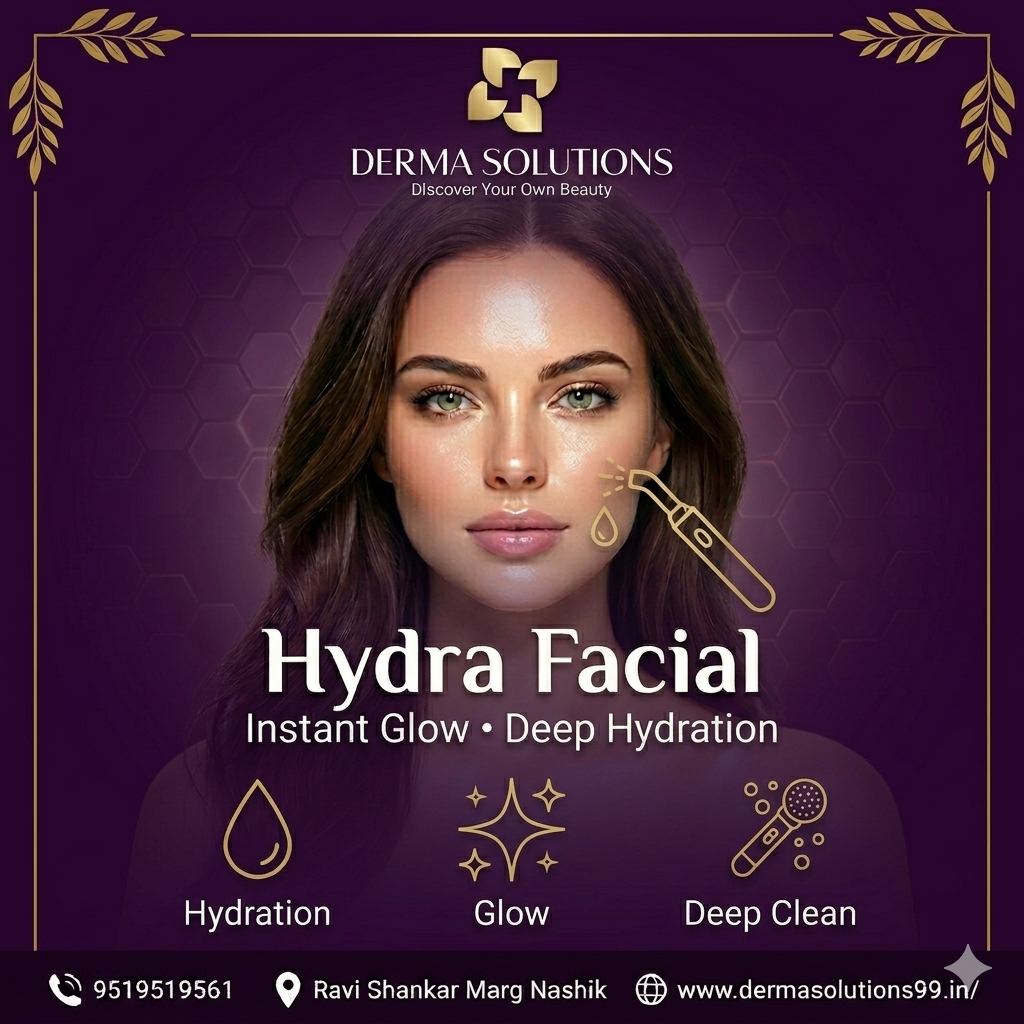 Hydra Facial Price in Nashik If you are searching for the Hydra Facial price in Nashik, it is important to understand both the cost and the benefits of this advanced skin treatment. Hydra Facial is a popular non-invasive facial that deeply cleanses, exfoliates, hydrates, and rejuvenates the skin, making it suitable for all skin types. At Derma Solutions, Hydra Facial treatments are performed using advanced technology to provide instant glow and long-lasting skin health benefits. What is Hydra Facial? Hydra Facial is a multi-step facial treatment that includes cleansing, exfoliation, extraction, hydration, and antioxidant protection. It helps improve overall skin quality without downtime. This treatment is ideal for: Dull and dehydrated skin Uneven skin tone Clogged pores Fine lines and early ageing signs Oily and acne-prone skin Hydra Facial Price in Nashik The cost of Hydra Facial in Nashik can vary depending on: Type of Hydra Facial (basic, advanced, premium) Skin concerns being treated Number of sessions required Clinic technology and expertise 💡 Average Price Range: Hydra Facial in Nashik typically starts from ₹2, 000 to ₹6, 000 per session depending on customization and add-ons. For accurate pricing, a consultation is recommended to assess your skin type and needs. Benefits of Hydra Facial ✔ Deep cleansing and exfoliation ✔ Instant skin glow and hydration ✔ Improves skin texture and tone ✔ Reduces fine lines and dullness ✔ Suitable for all skin types It is one of the most effective treatments for achieving a fresh and radiant look instantly. Why Choose Derma Solutions in Nashik Derma Solutions offers advanced facial treatments with a focus on visible results and skin safety. Key highlights: Advanced Hydra Facial technology Personalized treatment plans Safe and hygienic environment Suitable for all skin types Professional cosmetology care Who Should Get Hydra Facial? Hydra Facial is suitable for: Individuals with dull or dry skin People looking for instant glow before events Acne-prone or oily skin types Anyone wanting healthy and refreshed skin Book Your Hydra Facial If you are looking for the best Hydra Facial price in Nashik, expert consultation can help you choose the right treatment for your skin. Book your appointment today and achieve clean, hydrated, and glowing skin.