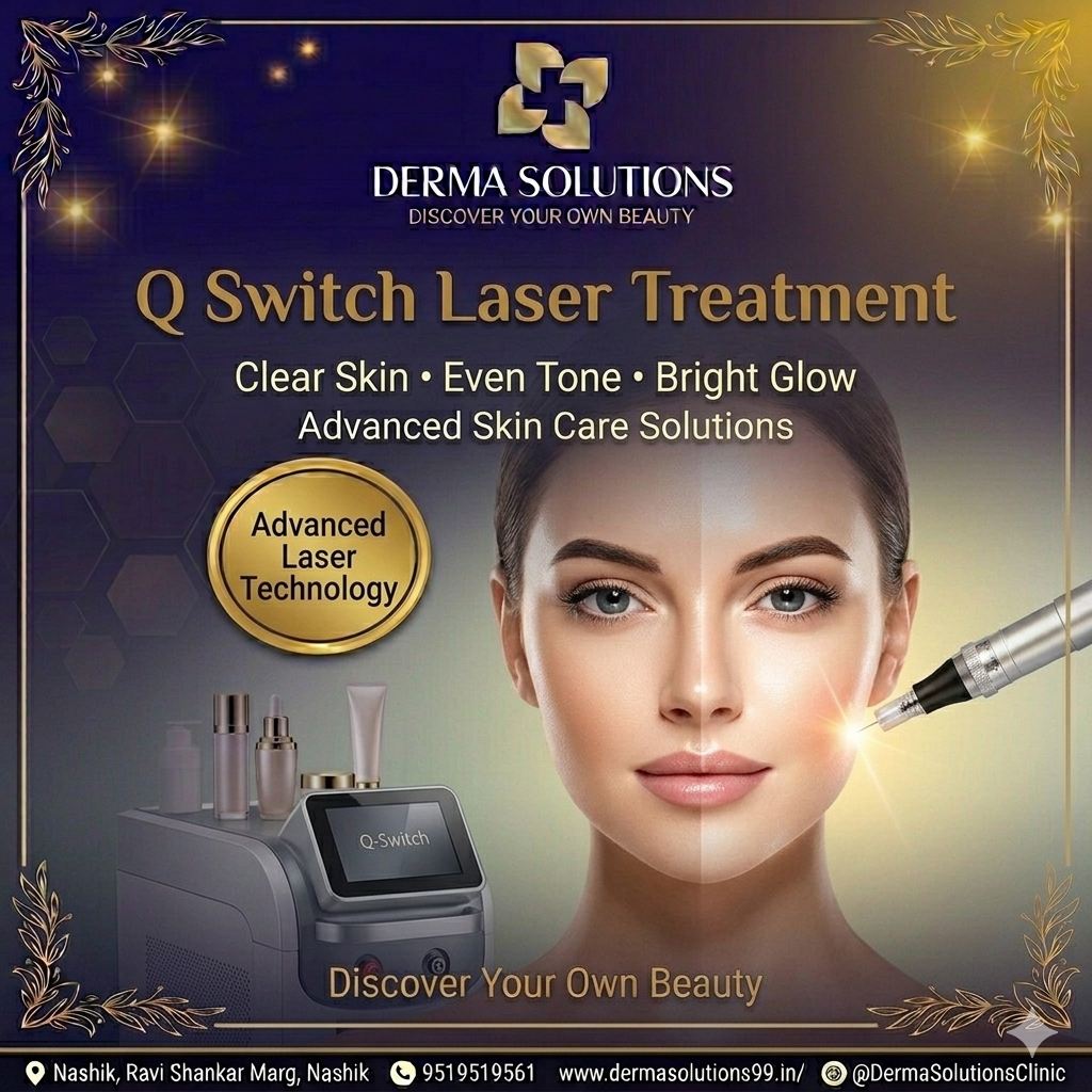Q Switch Laser Treatment Q Switch laser is an advanced and effective treatment used for reducing pigmentation, acne marks, tanning, and uneven skin tone. It works by delivering high-intensity laser pulses that target excess melanin and break down pigmentation particles in the skin. At Derma Solutions, Q Switch laser treatments are performed using advanced technology to ensure safe, precise, and visible skin improvement. What is Q Switch Laser? Q Switch laser is a non-invasive skin treatment that helps improve overall skin clarity and tone. The laser energy penetrates the skin and targets melanin, helping reduce pigmentation and enhance natural glow. It is commonly used for: Pigmentation and dark spots Acne marks and scars Uneven skin tone Tanning and dull skin Skin brightening Benefits of Q Switch Laser ✔ Reduces pigmentation and dark spots ✔ Improves skin tone and clarity ✔ Enhances skin glow ✔ Non-invasive and safe ✔ Minimal downtime Who Should Consider This Treatment? Q Switch laser is suitable for individuals who: Have pigmentation or acne marks Want brighter and clearer skin Experience dull or uneven skin tone Prefer non-surgical treatments Safety & Professional Care Laser treatments should always be performed by trained professionals using proper equipment. Skin type and concern must be evaluated before treatment. At Derma Solutions, treatments are customized for safe and effective results. Why Choose Derma Solutions in Nashik Advanced Q Switch laser technology Personalized treatment plans Safe and hygienic environment Professional and experienced care Visible and long-lasting results Book Your Consultation If you are looking for Q Switch laser, expert consultation can help you achieve clearer, brighter, and glowing skin. Book your appointment today.